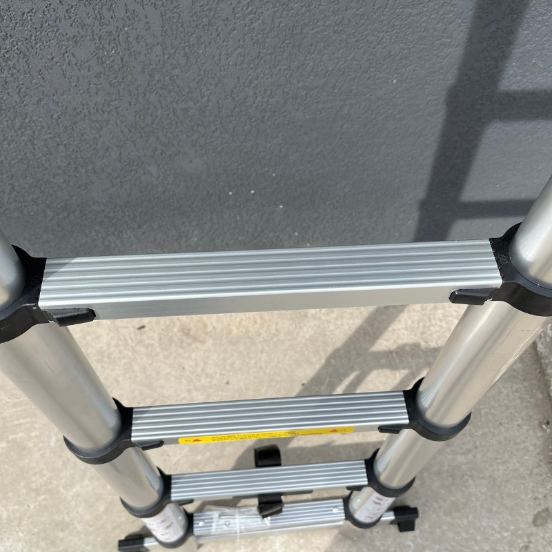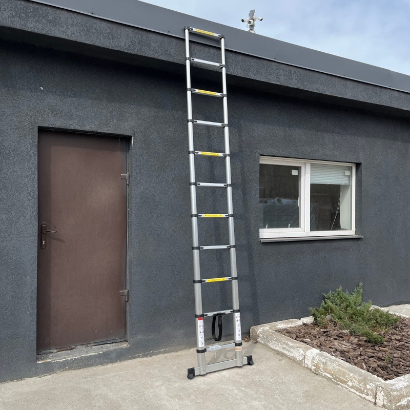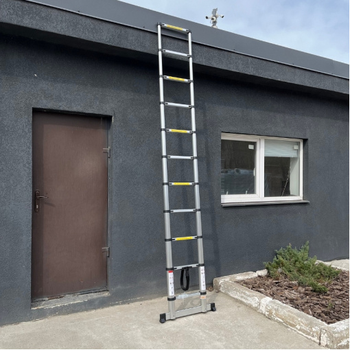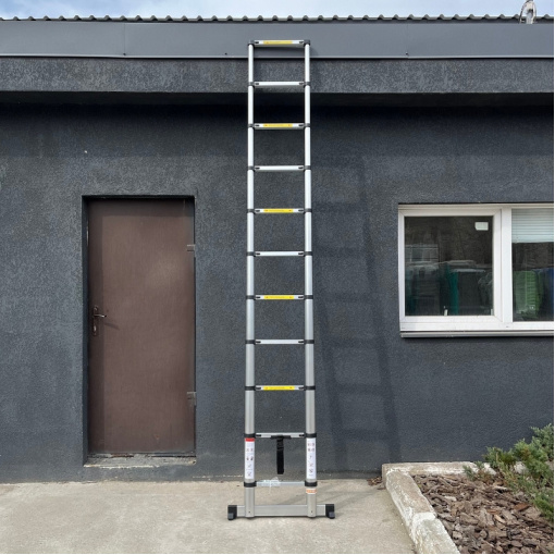 Телескопічна драбина 3 м на 11 сходинок виготовлена із якісного алюмінію і призначена для робіт на висоті до 4-ьох метрів.