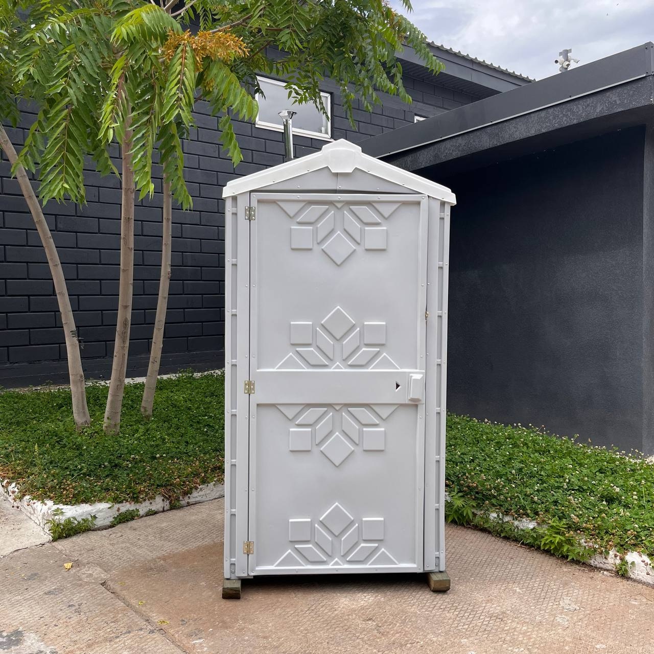 Туалетна кабіна сіра з пісуаром використовується в місцях, де відсутня централізована каналізація, на дачах, на будівельних майданчиках.